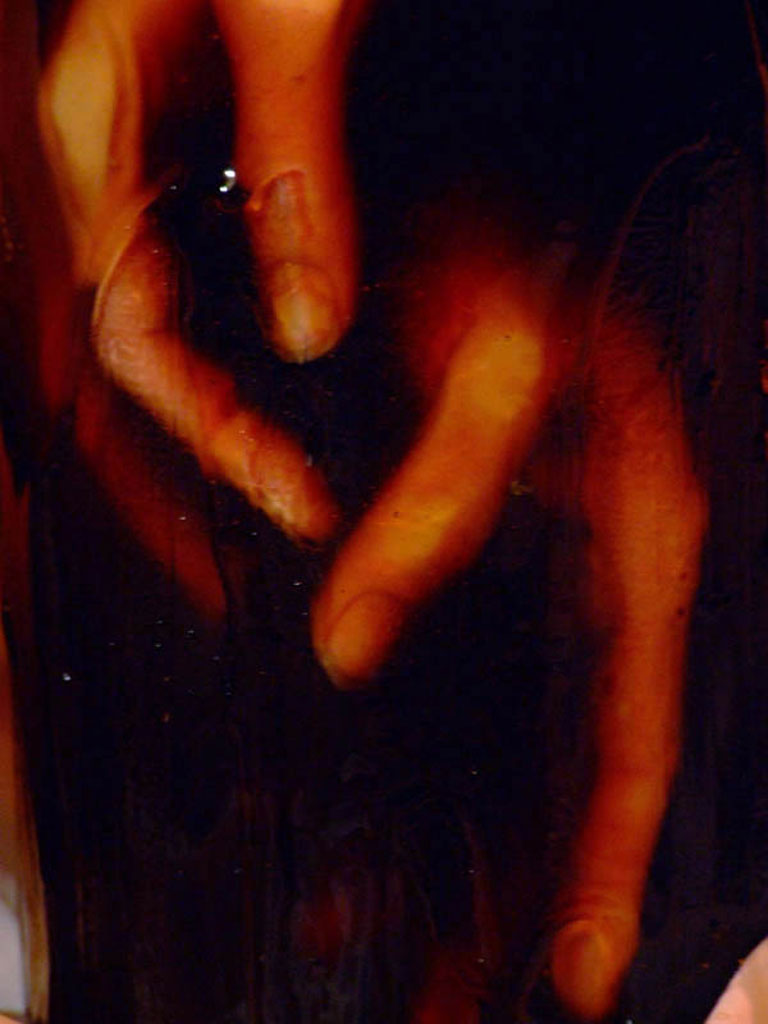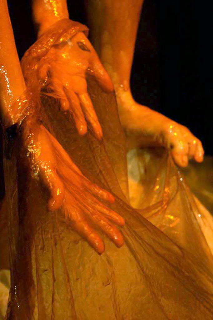 Miel, soie synthétique et corps humain de genre féminin.