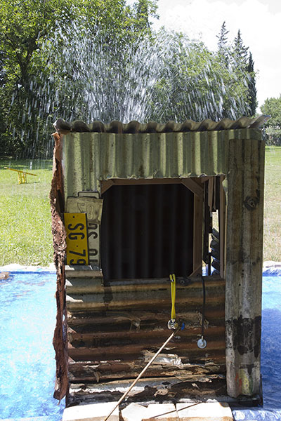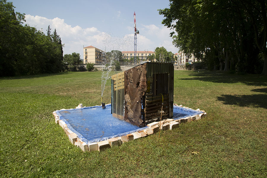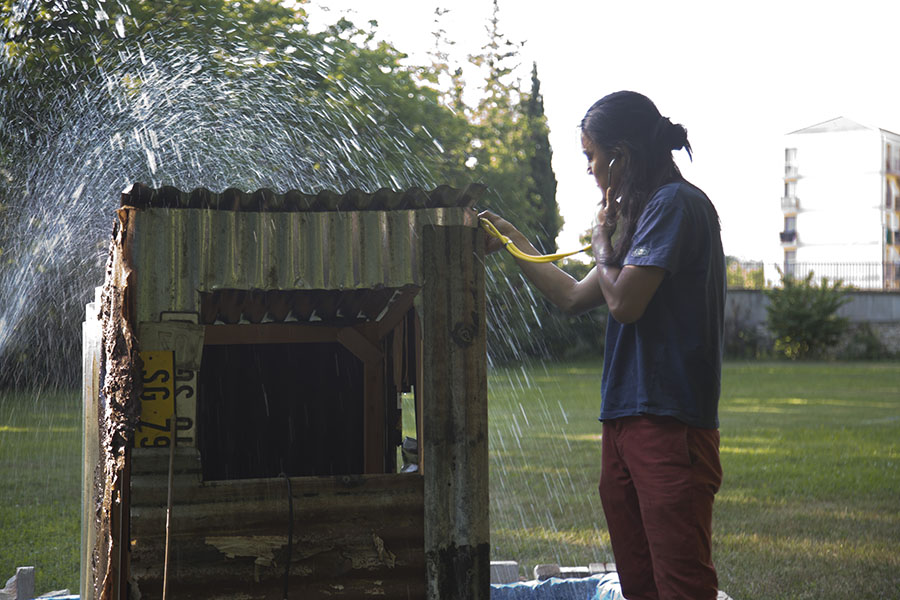 C’est cette expérience du monde si brute et sensuelle que j’ai voulu offrir au spectateur avec cette réplique au 1/5 d’une case comme on pourrait en trouver dans n’importe quel bidonville de cette planète. En reproduisant les conditions d’une pluie tropicale à l’aide une pompe et d’un simple tuyau, d’un bassin et d’un stéthoscope, le cœur de l’expérience s’offre là, battant dans la tôle qui s’anime et qui vibre de joie.
